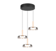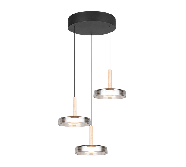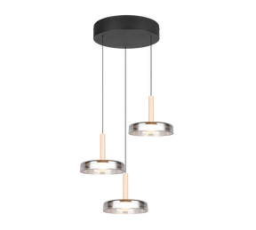 Suspension Céleste métal noir mat verres fumés, hauteur max 200 cm, hauteur min 50 cm, diamètre 35 cm, 3 x 7,5W, 3 x 750 lumens, 3000k. Grâce au variateur SWITCH intégré, vous pouvez régler la luminosité sur trois niveaux directement via l'interrupteur classique.