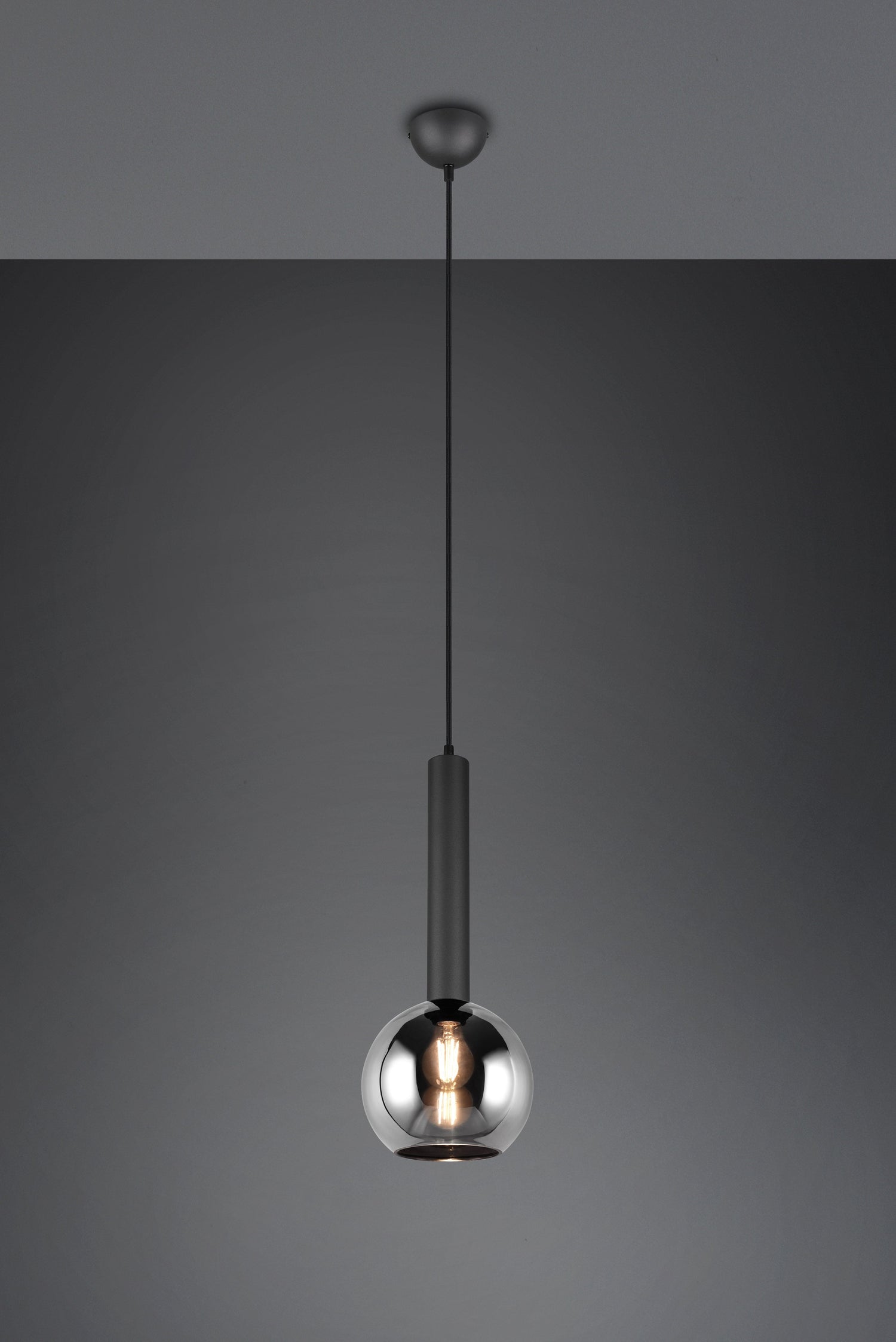 Suspension Calyton métal noir mat et verre chromé, hauteur 150 cm, diamètre 20 cm, E27.