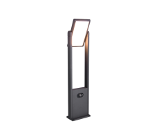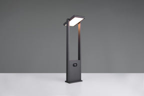 Borne fonte d'aluminium anthracite, hauteur 61 cm, largeur 15 cm, 5W, 700 lumens, 2300 à 4000K, IP65. Tête inclinable, détecteur de mouvement et détecteur crépusculaire, batterie rechargeable solaire, interrupteur marche/arrêt.