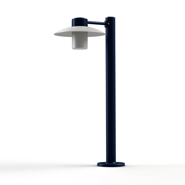 Borne AUBANNE en aluminium, E27, IP44, classe 1, réflecteur en polycarbonate opale, diffuseur verre dépoli. Teinte RAL 5011 Bleu acier 065. Garantie 25 ans anticorrosion sur l'aluminium
