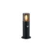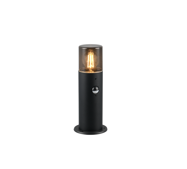 Borne Hoosic fonte d'aluminium noir mat et plastique noir, diamètre 12 cm, hauteur 30 cm, E27, IP44, détecteur de mouvement intégré.