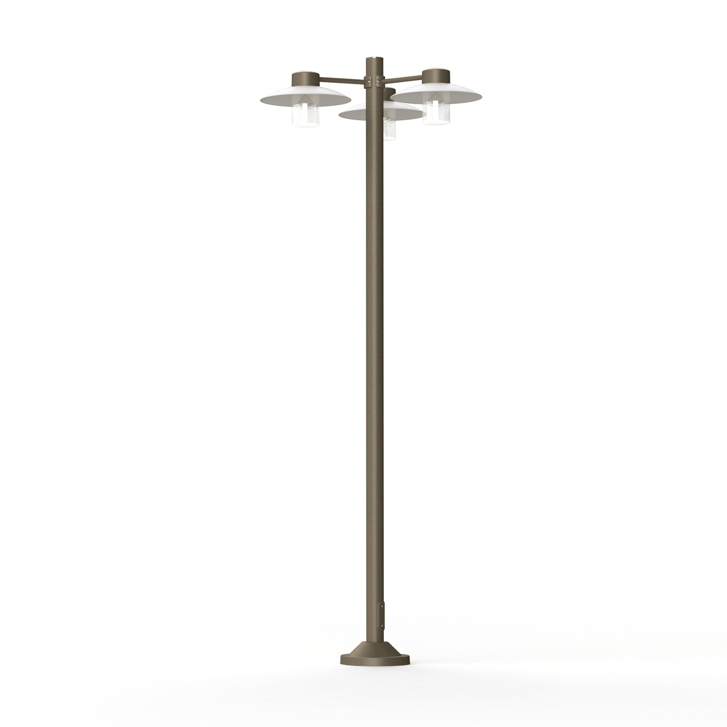 Lampadaire 3 têtes AUBANNE conçu pour l'éclairage extérieur professionnel. Structure en fonte d'aluminium avec finition Grès 054, certifiée IP44 et classe 1. Chaque tête accueille une ampoule E27 standard, équipée de réflecteurs en polycarbonate opale pour une diffusion optimale et de diffuseurs en verre clair garantissant une transmission lumineuse maximale. Protection anticorrosion garantie 25 ans sur l'aluminium, assurant une durabilité exceptionnelle en environnement extérieur.