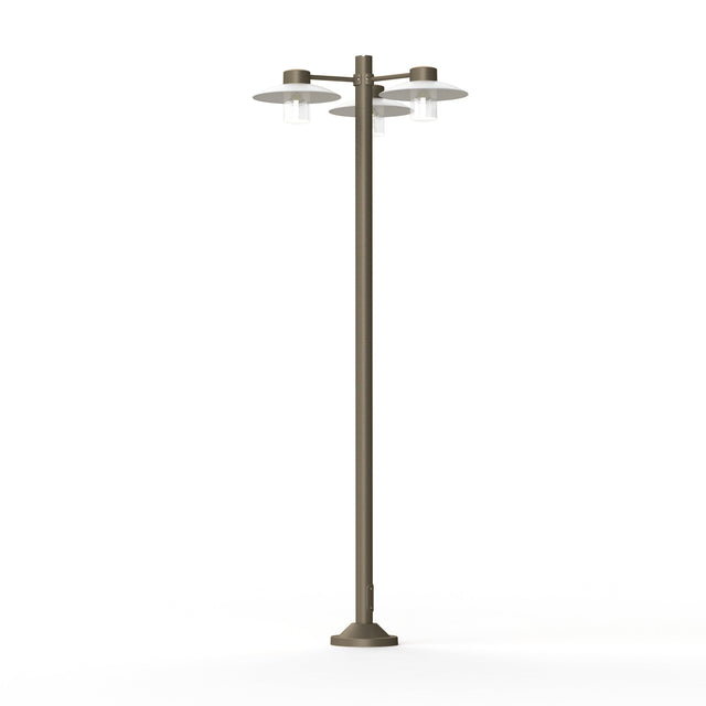 Lampadaire 3 têtes AUBANNE en fonte d'aluminium, E27, IP44, classe 1, réflecteurs en polycarbonate opale, diffuseurs verre clair. Teinte Grès 054. Garantie 25 ans anticorrosion sur l'aluminium