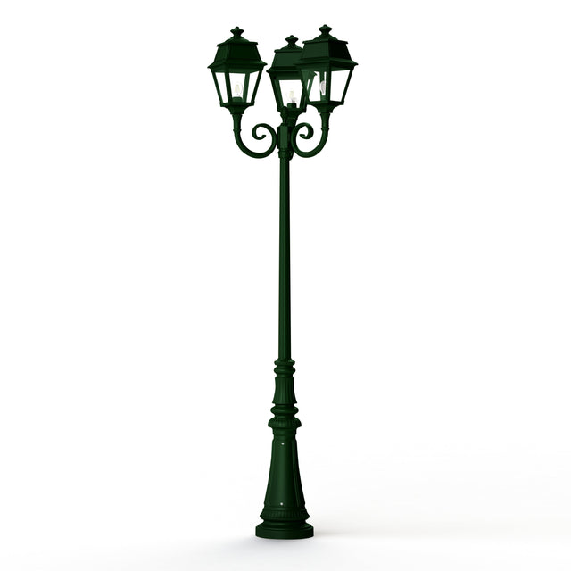 Lampadaire 3 têtes AVENUE 2 en fonte d'aluminium, E27, IP44, classe 1, diffuseurs verre clair. Teinte RAL 6009 Vert anglais 019. Garantie 25 ans anticorrosion sur l'aluminium