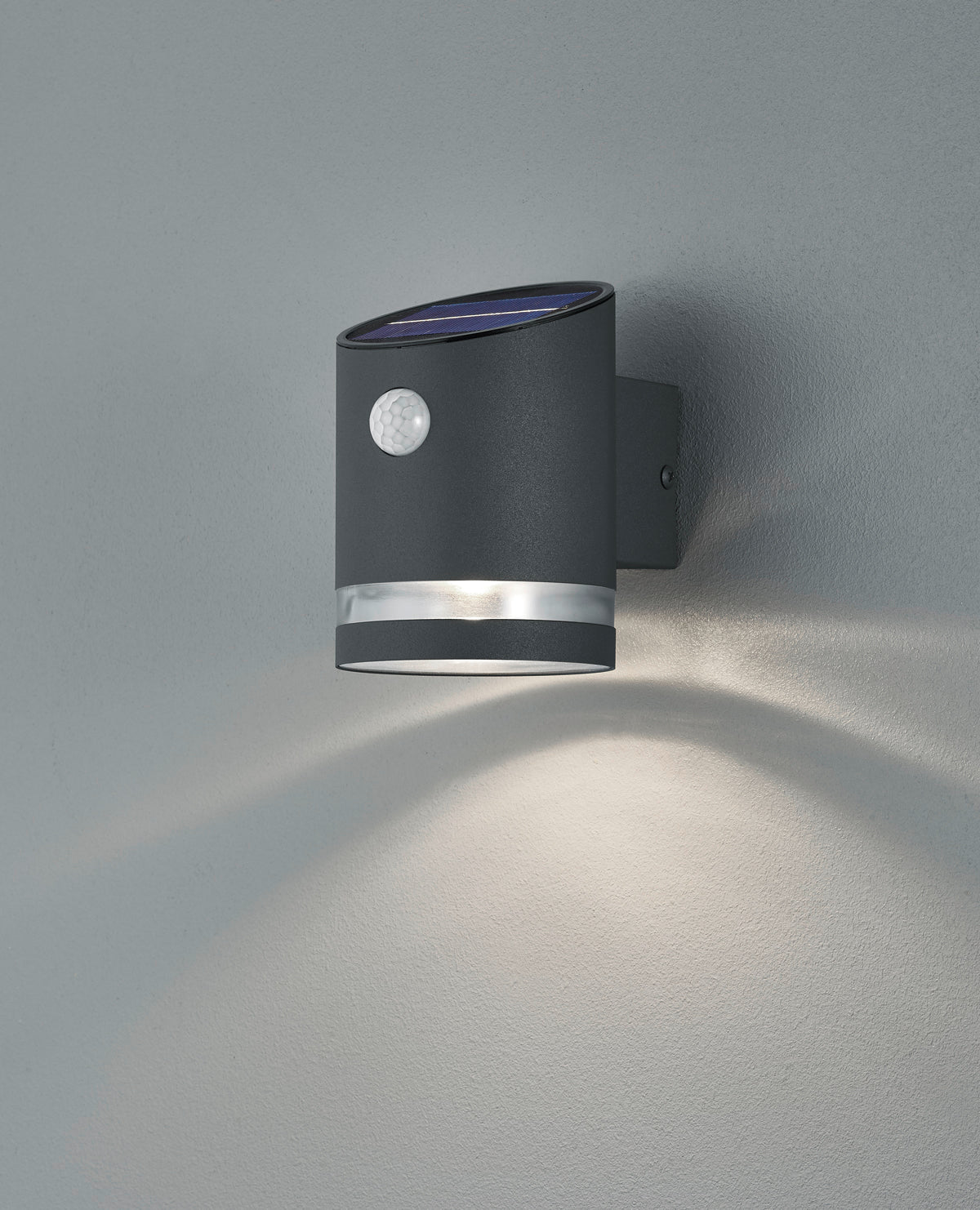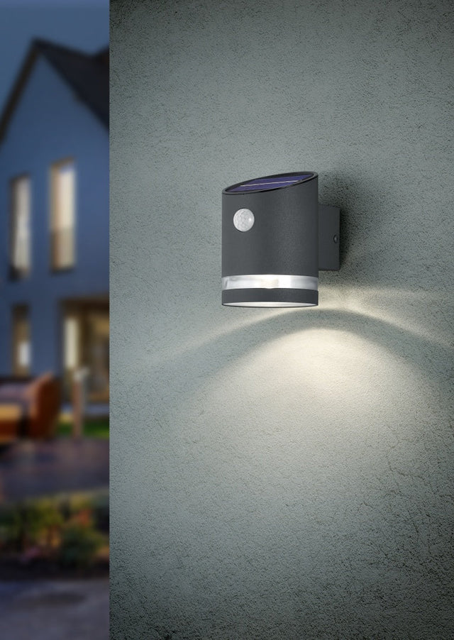 Applique Salta solaire acier inoxydable anthracite, hauteur 13 cm, largeur 9 cm, 3W, 165 lumens, 3000k, IP44, capteur de mouvement intégré, batterie solaire rechargeable.