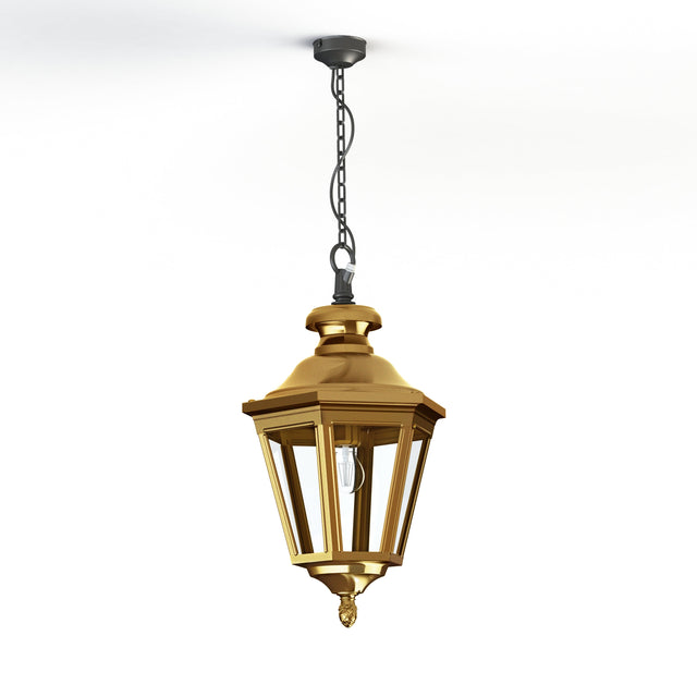 Suspension chaîne LOUIS XIII, E27, IP44, classe 1, diffuseurs verre clair. Matière lanterne : laiton vernis teinté 070. Matière chaîne : aluminium. Teinte RAL 9005 noir foncé 000