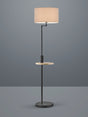 Lampadaire Claas métal noir et abat jour tissu gris, hauteur 160 cm, largeur 40 cm, E27.  Dispose d'une petite table en bois et d'un port USB avec fonction de recharge.