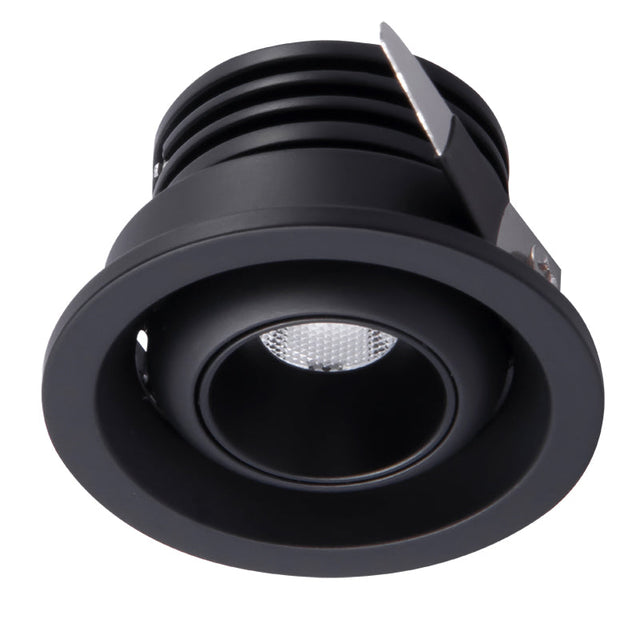 Spot encastré orientable Neptune en aluminium noir 3w 210 lumens 2700K angle d'éclairage 40 degrés, diamètre 5 cm, hauteur 3 cm, diamètre encastrement 4,2 cm, orientable sur 30 degrés, classe 2, IP20