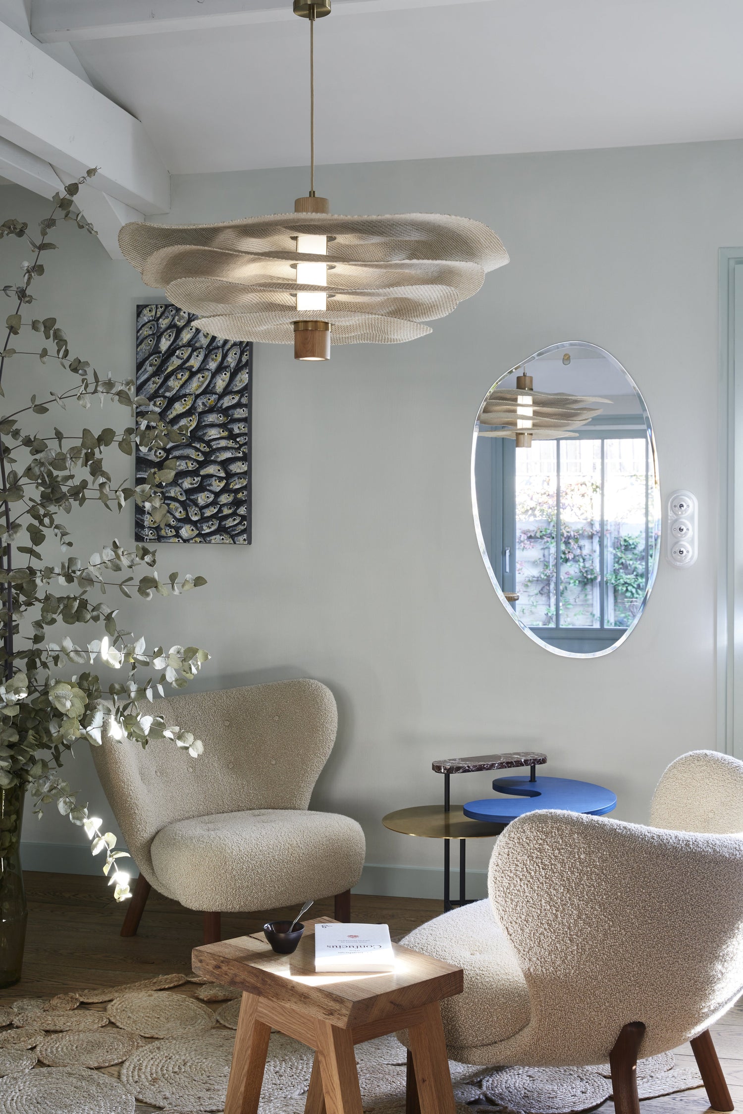 Suspension 2 lumières. Superposition de 4 abat-jour en matière Varian®. Diffuseur en verre opale, en bois de chêne et laiton brossé équipée d'un cordon textile. Coloris : naturel. IP20. D78cm - H240cm. Classe 2. R7S-15W + GU10-10W.