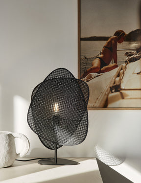 Lampe base en métal peint. Abat-jour composé de 2 écrans en cannage. Coloris : cannage noir. L33cm - P18cm - H51cm. IP20. Classe 2. E27-40W.