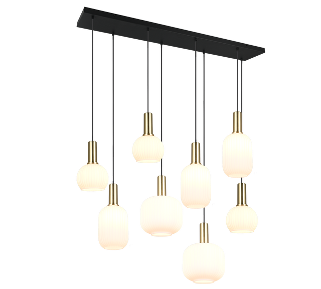 Suspension Diva métal or et verre blanc, hauteur 150 cm, largeur 120 cm, profondeur 32 cm, 8 x E27.